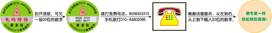 当您购买了爱多收,只需刮开电码防伪标识的涂层,就可见一组数字组成的号码,然后拨打免费电话8008303315(移动电话拨打010-64802566),根据语音提示输入该组号码(从左到右,从上到下),您就可以像专家一样鉴别产品的真伪。有三种查询情况的电脑语音: